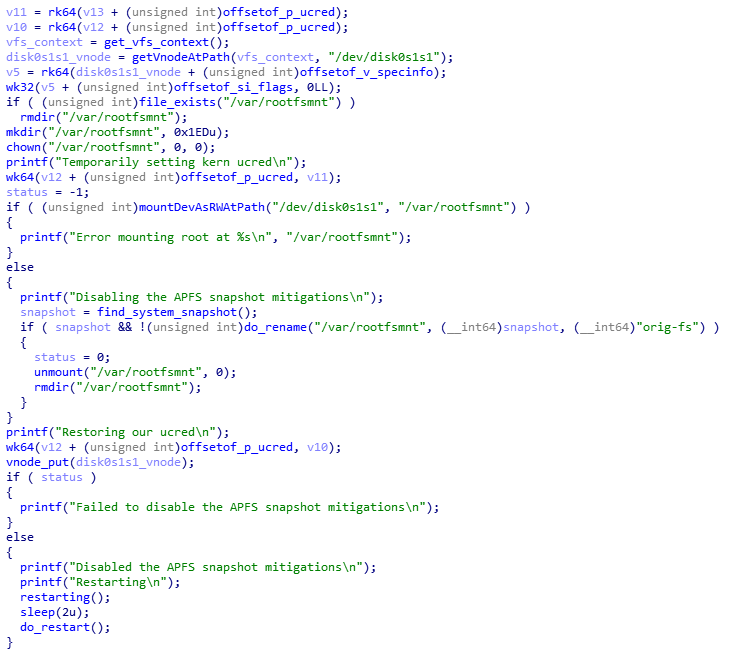 Ensuite on la fonction tente de monter la partition /dev/disk0s1s1 dans /var/rootfsmnt. Dès que celle-ci est montée l’app renomme “/var/rootfsmnt” en orig-fs.