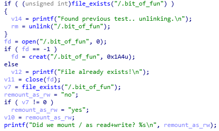 D’après le pseudocode généré par IDA Pro, voici comment fonctionne cette fonction : L’outil effectue une vérification pour voir si le dossier /var/rootfsmnt existe, puis le supprime si la condition est vraie. Il créé ensuite le répertoire qui est vérifié plus tôt. Et (si je comprends bien) défini les identifications du noyau temporairement pour monter les rootfs.