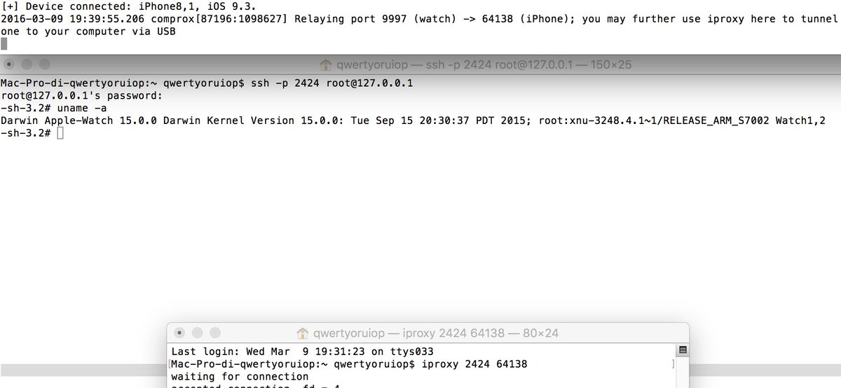 Le fait est que l’Apple Watch n’a pas d’interface réseau Wifi. Pour se connecter via SSH il faut donc se connecter à la Watch depuis l’iPhone par Bluetooth depuis un ordinateur. Pour cela il faut utiliser un client pour com.apple.companion_proxy developpé par Luca Todesco pour son jailbreak. A l’aide de cet outil on va pouvoir rediriger lier le port 22 de la montre connectée vers un port aléatoire non-utilisé sur l’iPhone.