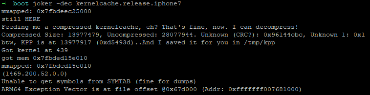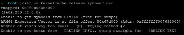 Dans un post, Brandon Azad a notifié d’un changement de format du kernelcache de certains appareils. En effet, en voulant décompresser un kernelcache d’iPhone 6 Plus on voit bien que joker a du mal a trouver les symboles du fichier.