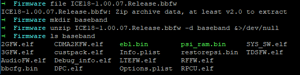 Les fichiers qui composent le firmware du baseband sont compressés au format ZIP dans le fichier ICE18-1.00.07.Release.bbfw (ICE correspond au firmware de Intel) . Pour les extraire on peut utiliser l’utilitaire unzip.