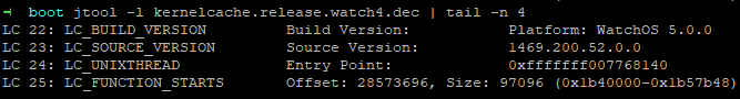 En listant les 4 dernières sections du fichier Mach-O, la plateforme est WatchOS 5.0.0, qui correspond à la mise à jour qui sera disponible au public.