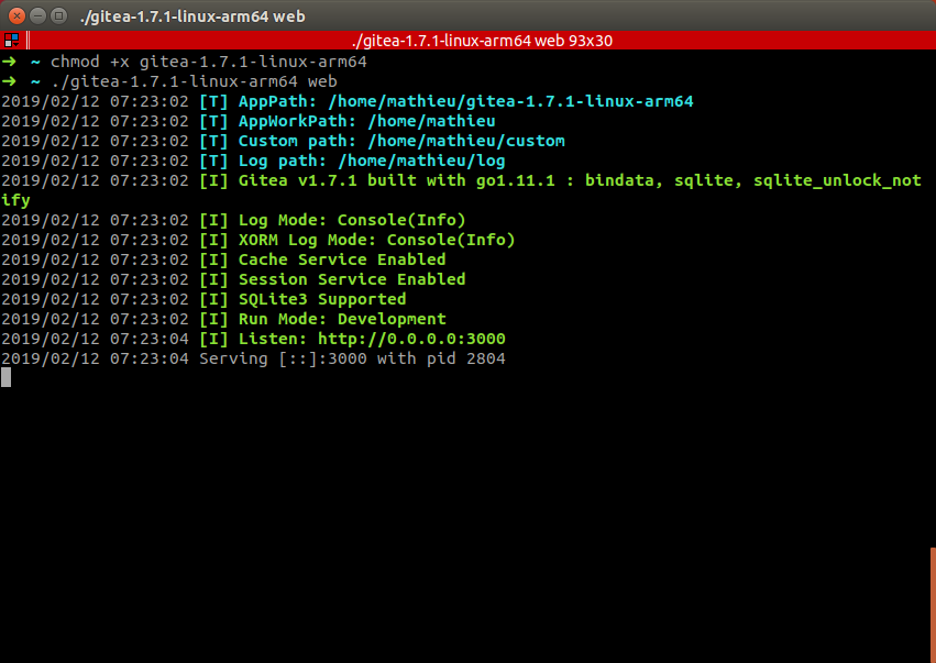 Donnez les droits d’exécution à Gitea puis lancez-le comme ceci : ./gitea-1.7.1-linux-arm64 web.