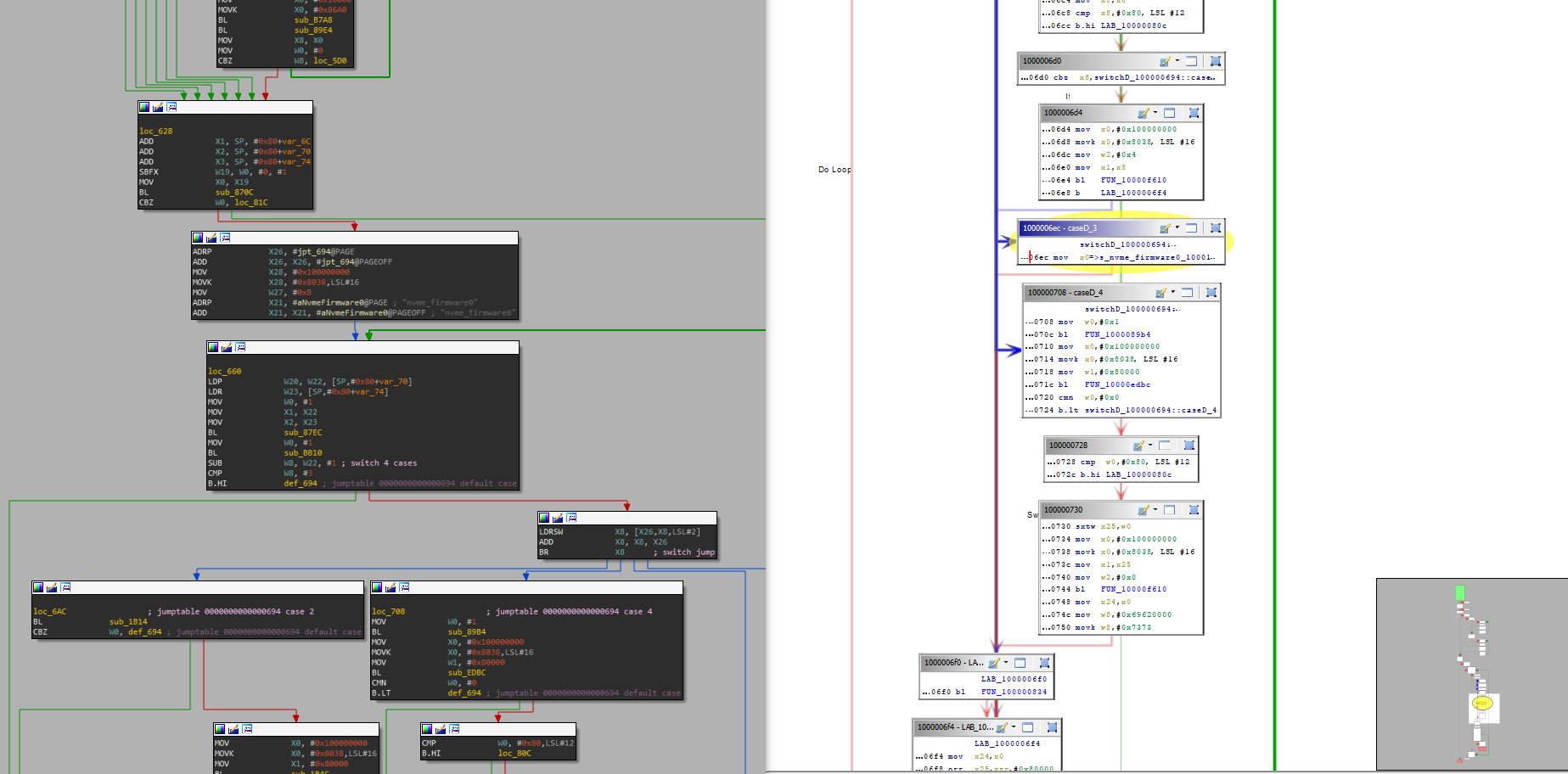 Donc à gauche vous avez la vue en graphique de IDA PRO (avec thème sombre) et à droite celle de Ghidra.