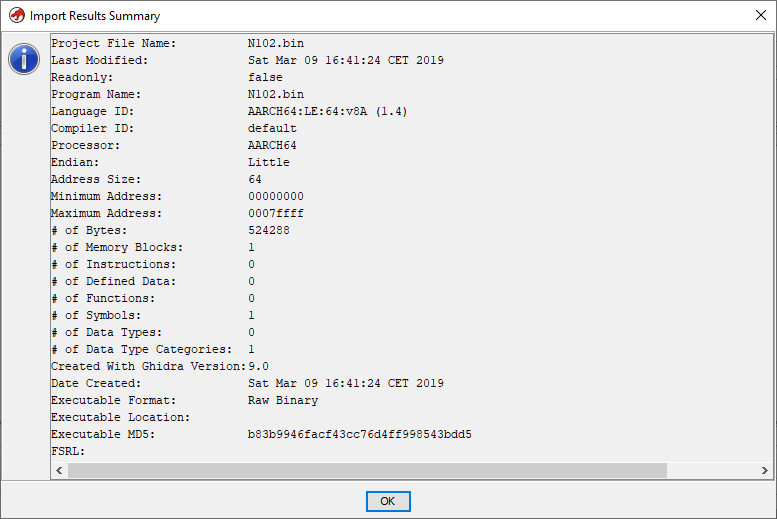 Lors du chargement du fichier Ghidra va afficher quelques informations sur celui-ci.