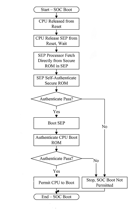 Lors du démarrage d’un iPhone, le CPU est initialisé et va ainsi initialiser le SEP, et le démarrer. Celui-ci vérifie lui-même son intégrité, puis il va ensuite vérifier l’intégrité de la BootROM. Si l’authentification n’est pas validée, le SEP n’autorise pas le démarrage de la BootROM.