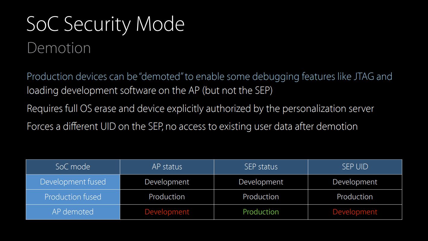Par défaut sur les appareils de production, Apple ne permet pas de debugger le SEP via JTAG ou SWD. Grace à ce type de debugging de bas niveau il serait donc possible d’extraire la ROM du SEP (SEPROM), mais aussi charger des images modifiées ou utiliser la GID-key pour déchiffrer d’autres images du même SoC.