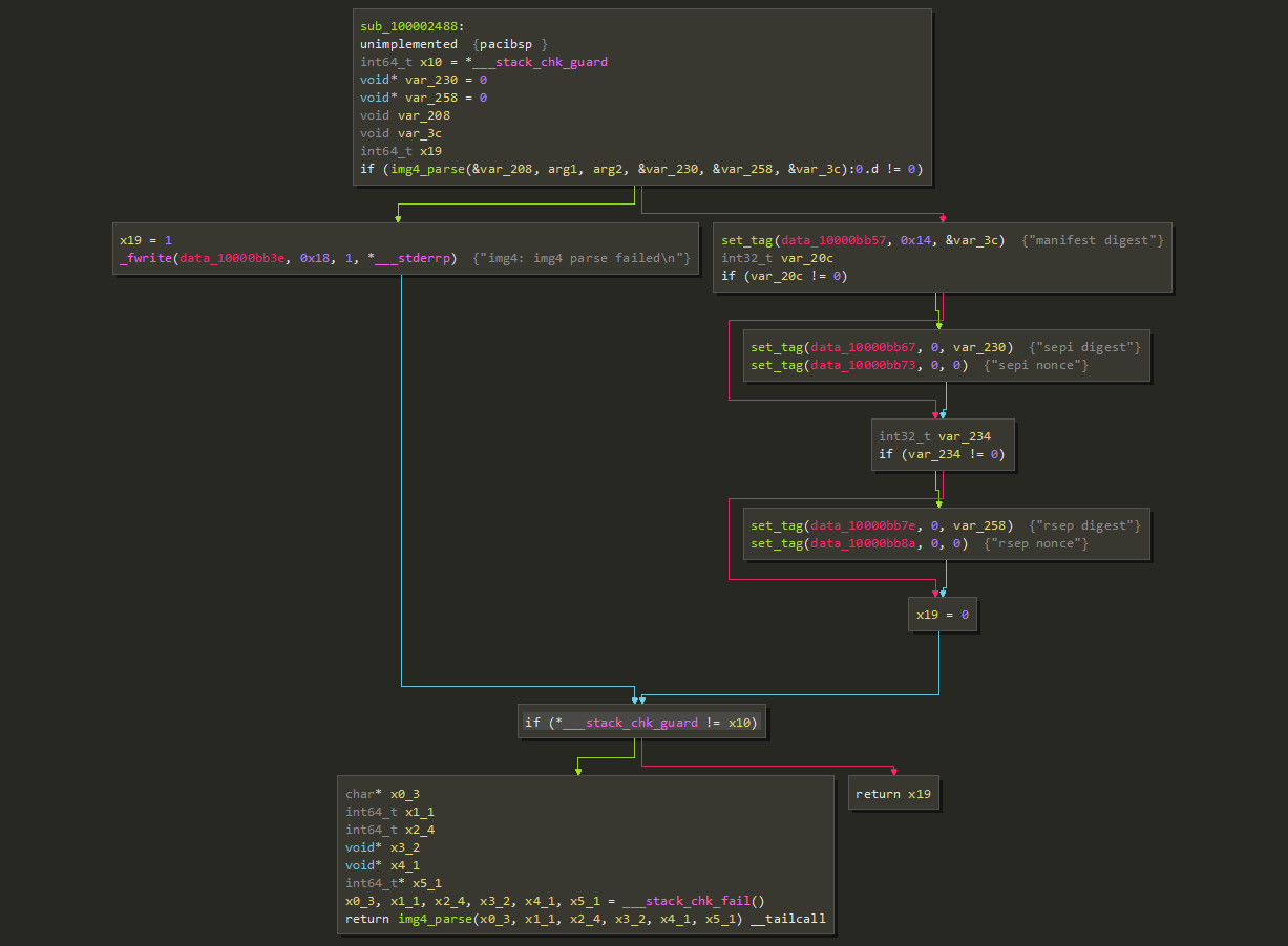 Pour charger le SEP, seputil doit parser le firmware qui est dans un conteneur img4. Le type de format img4 est aussi utilisé sur les autres fichiers de démarrage comme l’iBoot. On retrouve donc plusieurs références à ce format dans le dît fichier.