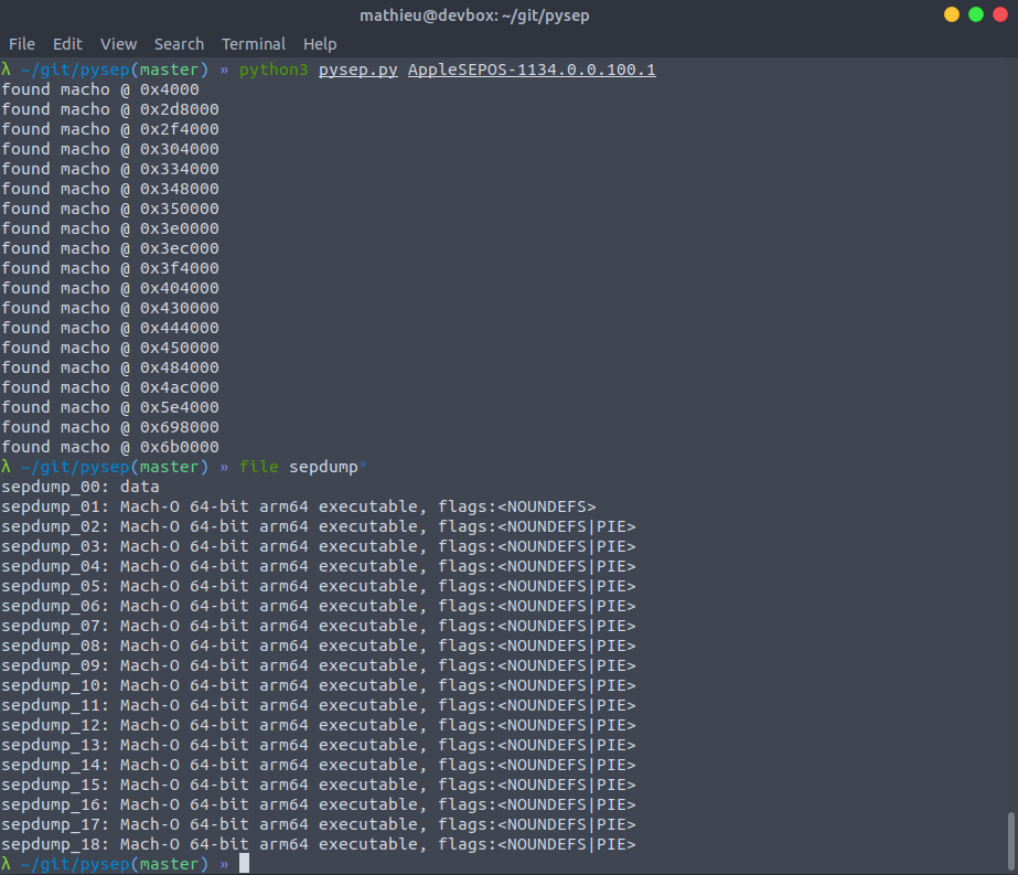 Pour faciliter l’extraction des différents fichiers, j’ai écrit un script en Python. Celui-ci parcourt le firmware et cherche les fichiers mach-o pour ensuite les extraire.