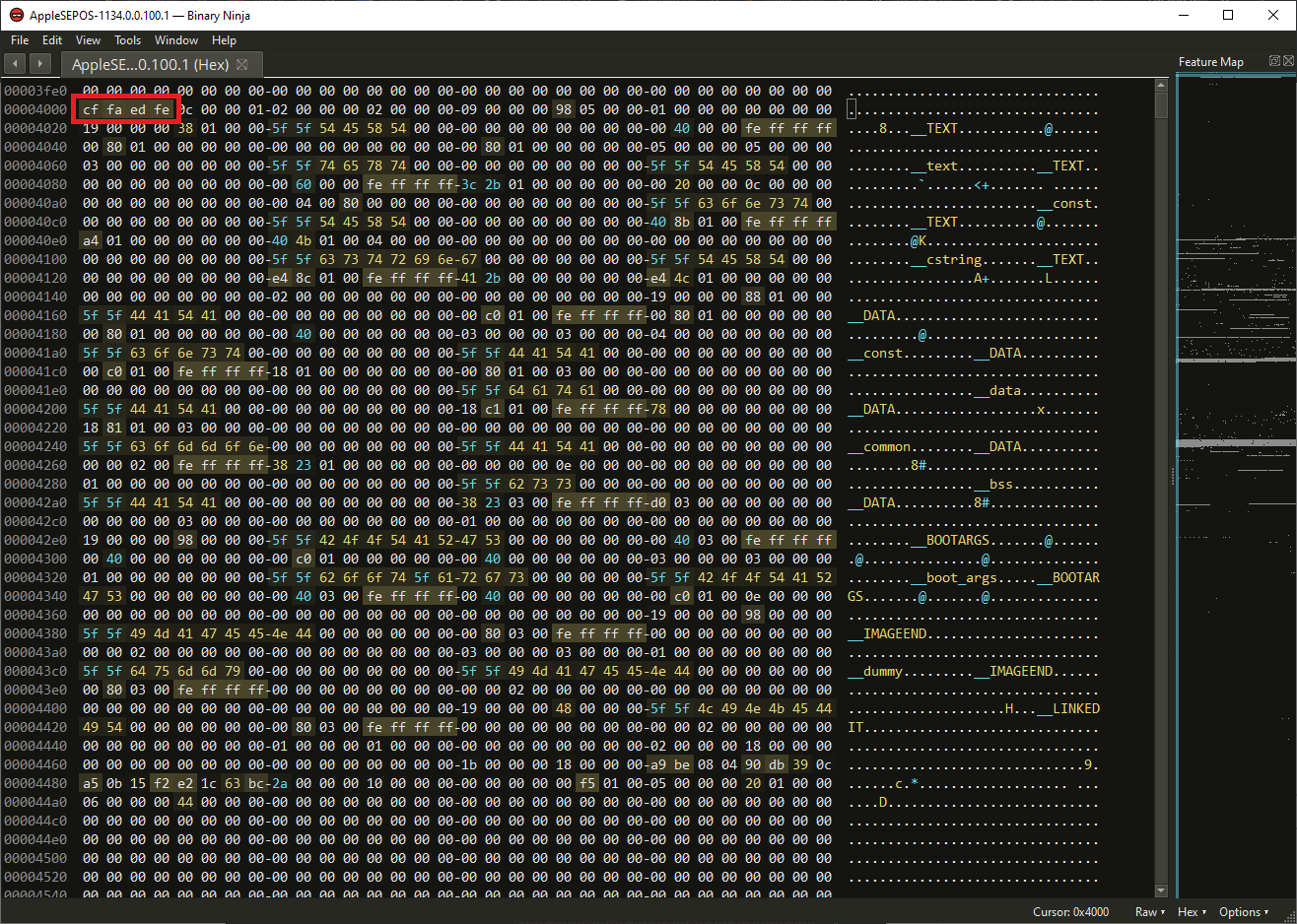 Ce sont en fait des fichiers au format mach-O qui sont des composants du firmware. Par défaut le premier fichier mach-o dans le firmware du SEP, c’est le kernel. Pour le localiser il suffit de chercher la première valeur magic d’un fichier mach-o 64 bits : feedfacf. Au format little-endian ça donne cffaedfe.