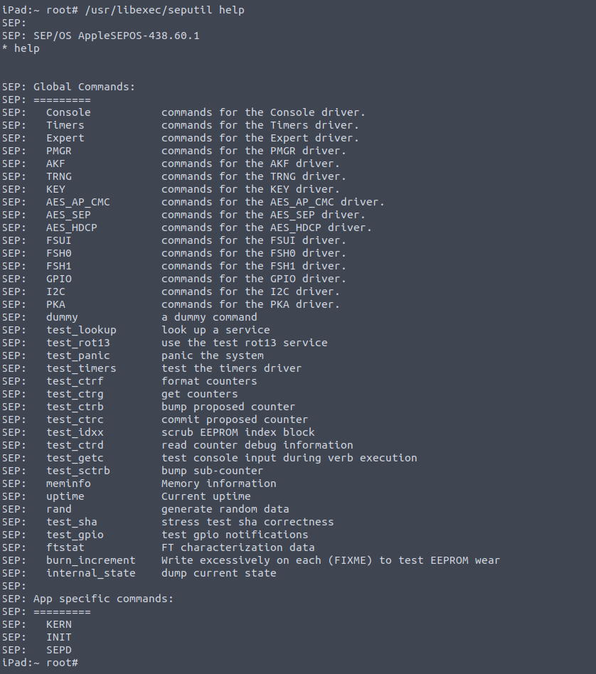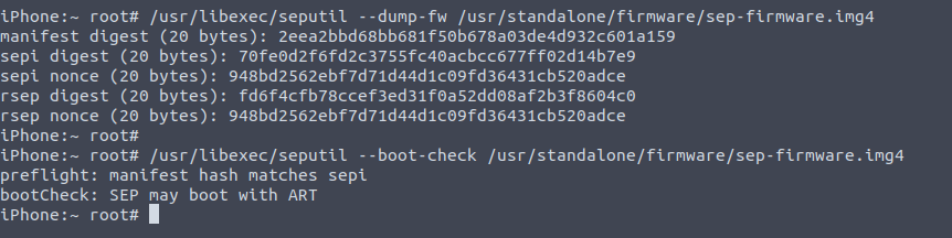 De plus sur certains appareils il est possible d’accéder à la console du SEP via seputil. Ce sont des commandes qui sont envoyées directement au SEPOS. Ces commandes fonctionnent uniquement en interagissant via la sortie série des appareils Apple.