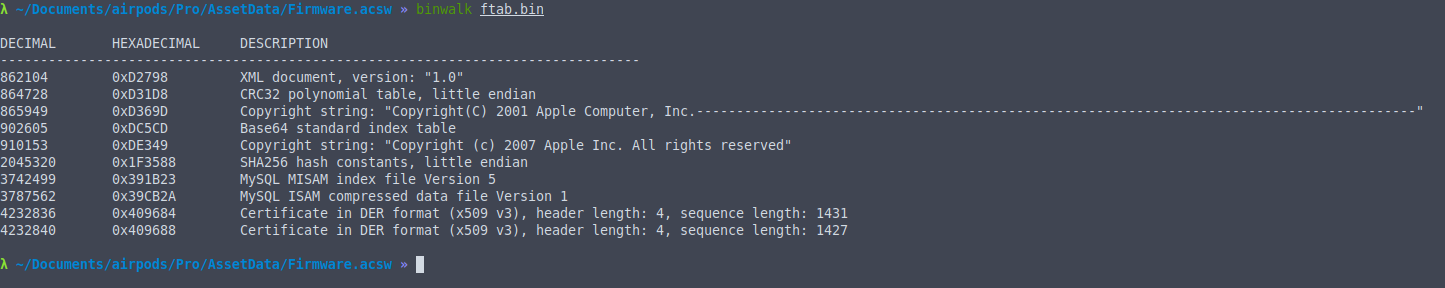 Le fichier ftab.bin est un fichier binaire pour architecture ARMv7e . La première chose que j’ai faite était de lancer binwalk pour analyser le fichier. Malheureusement ça n’a rien donné de concret.